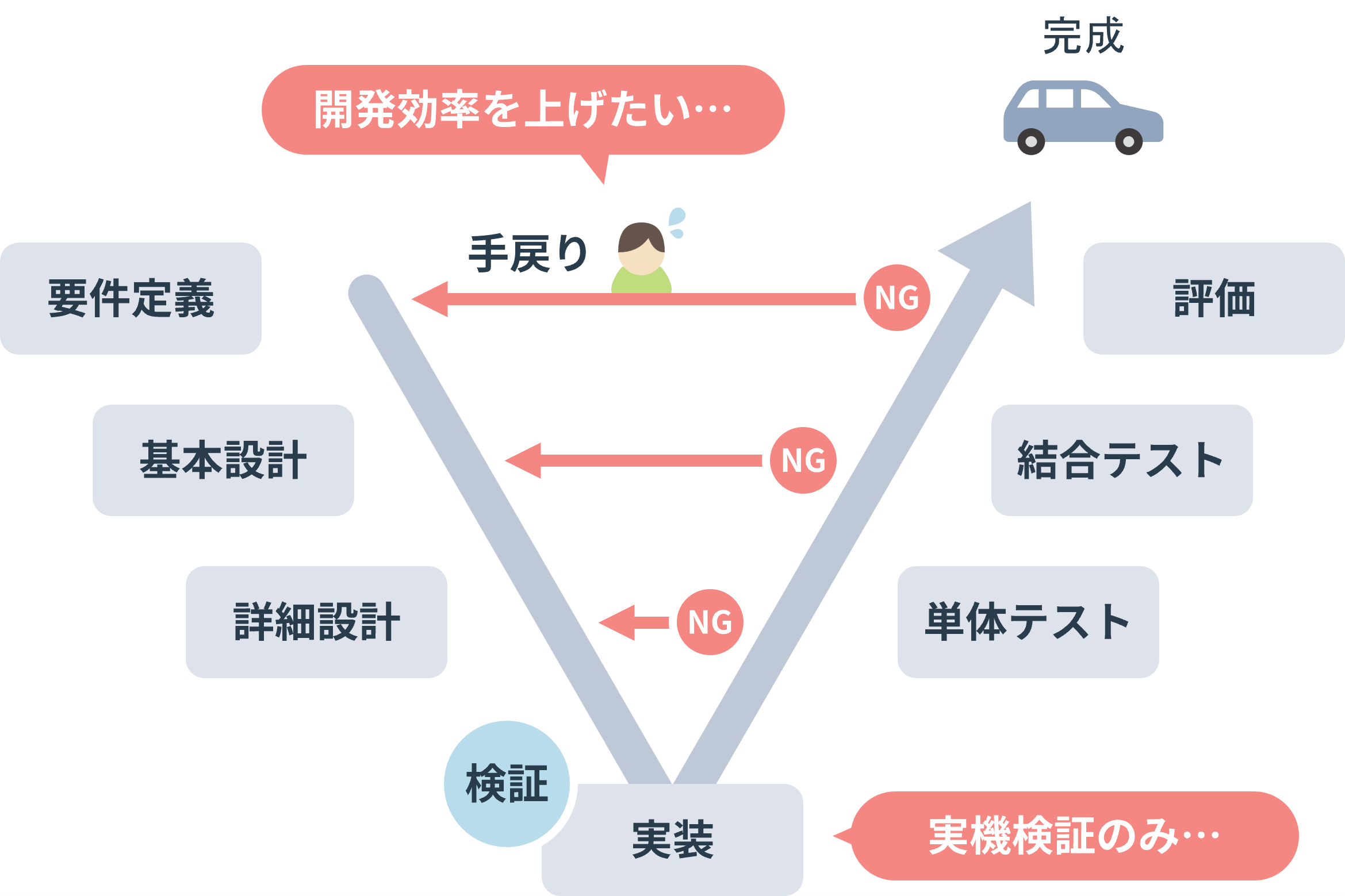 実機がないと動作検証ができず、開発リードタイムが長くなってしまう…。そこで、MBDの導入により、従来の制御ソフトを忠実に再現したモデルを作成。モデルを用いることで “実機レス” でシミュレーションできる環境を構築しました。