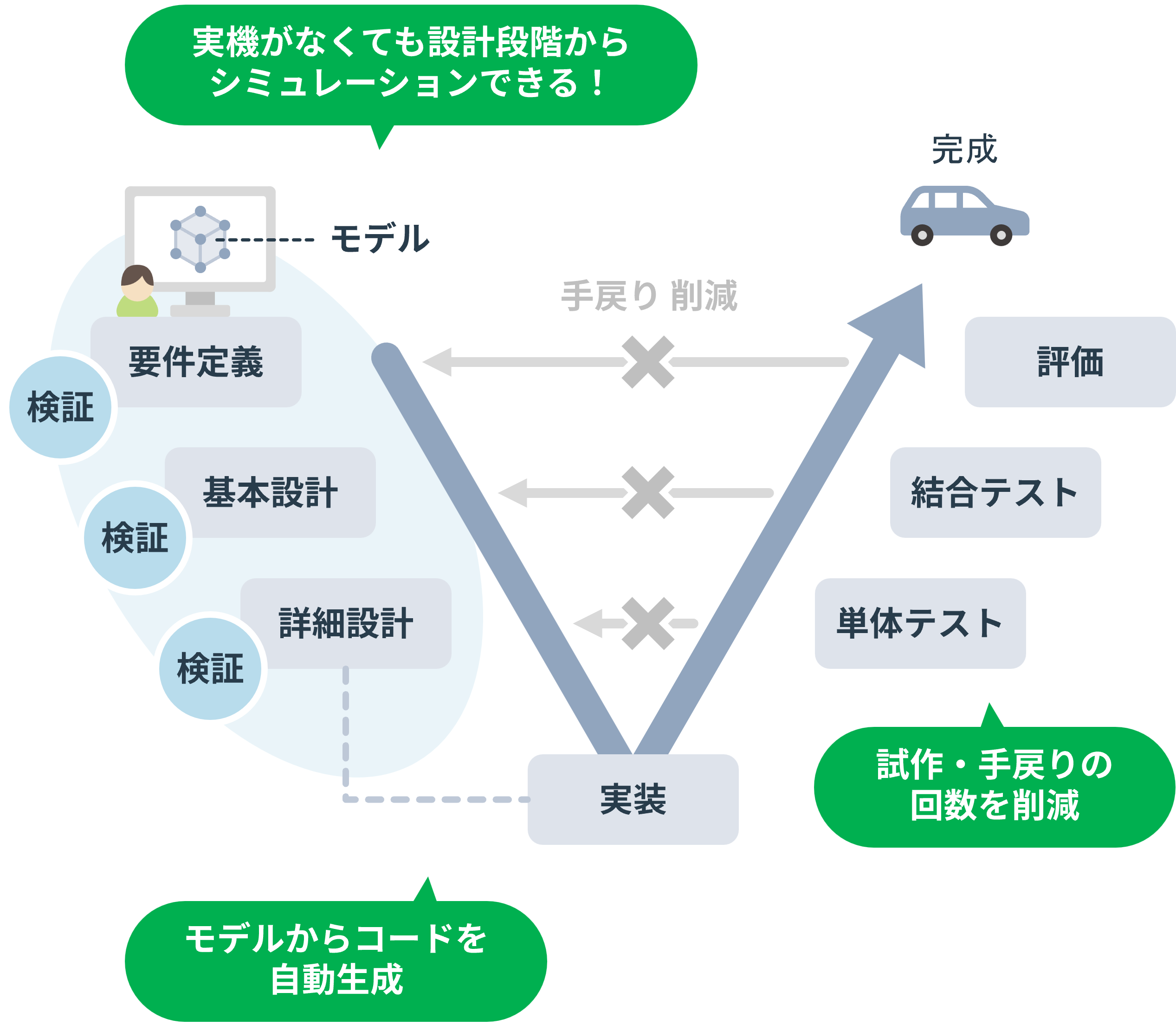 自動車や航空機、産業機器などの組込ソフトウェアを開発する際に事前にコンピューター上でモデルを設計し、このモデルを用いて動作検証などのシミュレーションを行うことで、効率よく開発を進めることができます。モデルベース開発 ( MBD ) とはこの開発手法を指します。