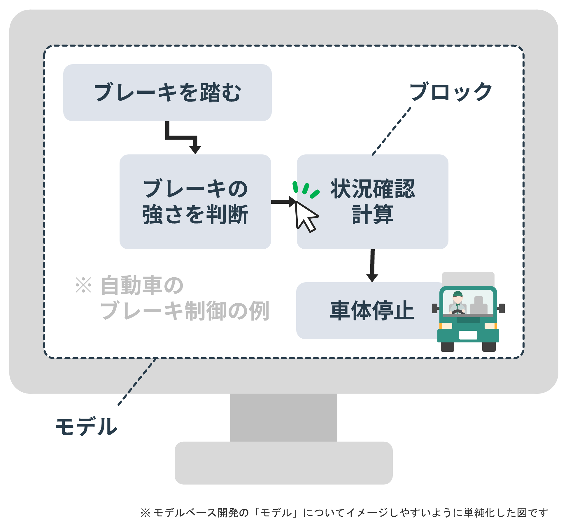たとえば、自動車を制御するシステムを開発するときに、いきなりプログラミングするのではなく、まずはシステムの動作や制御ロジックなどを再現した「モデル」をコンピューター上に作ります。