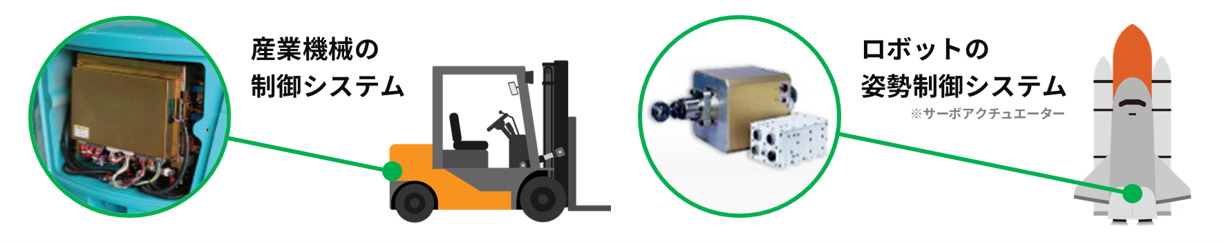 フォークリフトのような産業現場で活躍する機械から、ロケットなどの航空宇宙の分野で活躍する機械まで、あらゆる産業分野で活躍する機械を「安全かつ高精度」に制御するシステムを提供しています。
